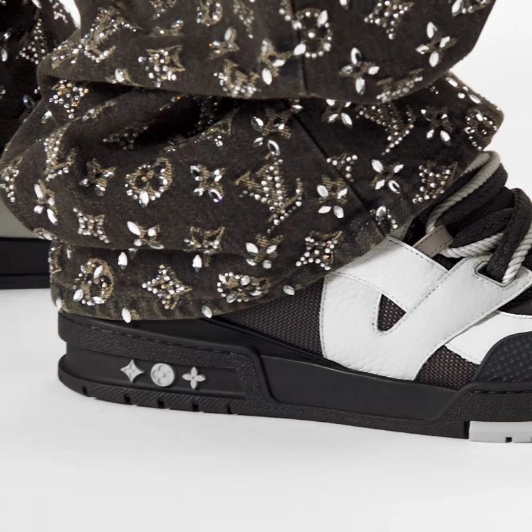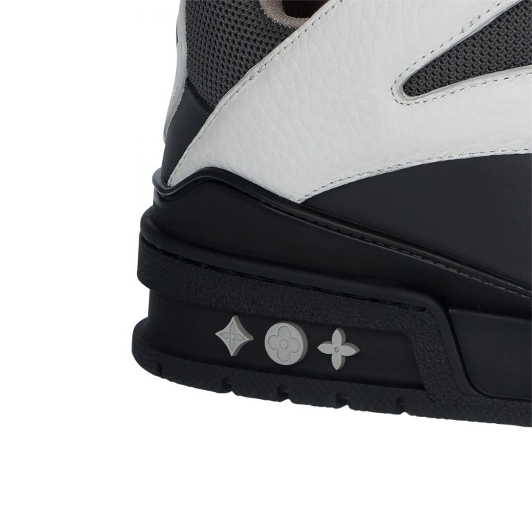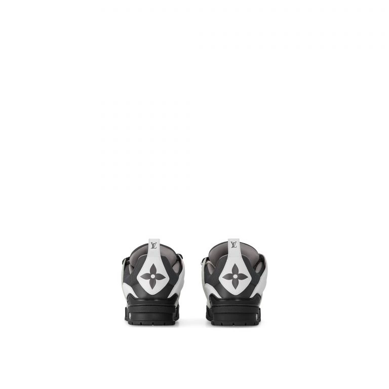 This exclusive edition of the LV Skate sneaker combines grained calf leather with technical mesh. On the side, the interlaced LV motif was inspired by Colm Dillane of KidSuper, who co-designed a part of the Louis Vuitton Fall-Winter 2023 show. Referencing skate shoes, this design is characterized by its padded collar and tongue with bicolor double laces and outsole.