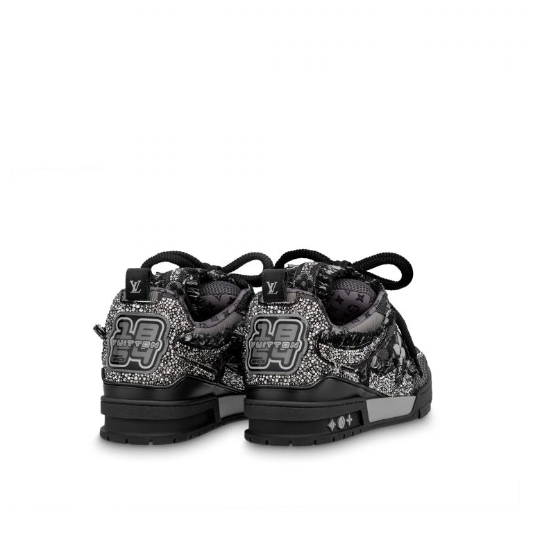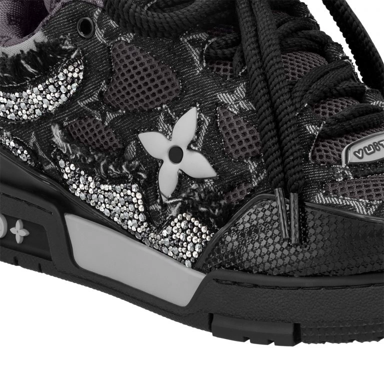 This exceptional edition of the LV Skate sneaker combines Monogram denim with sparkling Swarovski™ crystals and technical mesh. This Nineties-inspired design is characterized by its padded collar and tongue, which features an LV since 54 logo, referring to 1854, when Louis Vuitton was founded. Technical double laces and a bicolor rubber outsole complete this model.
