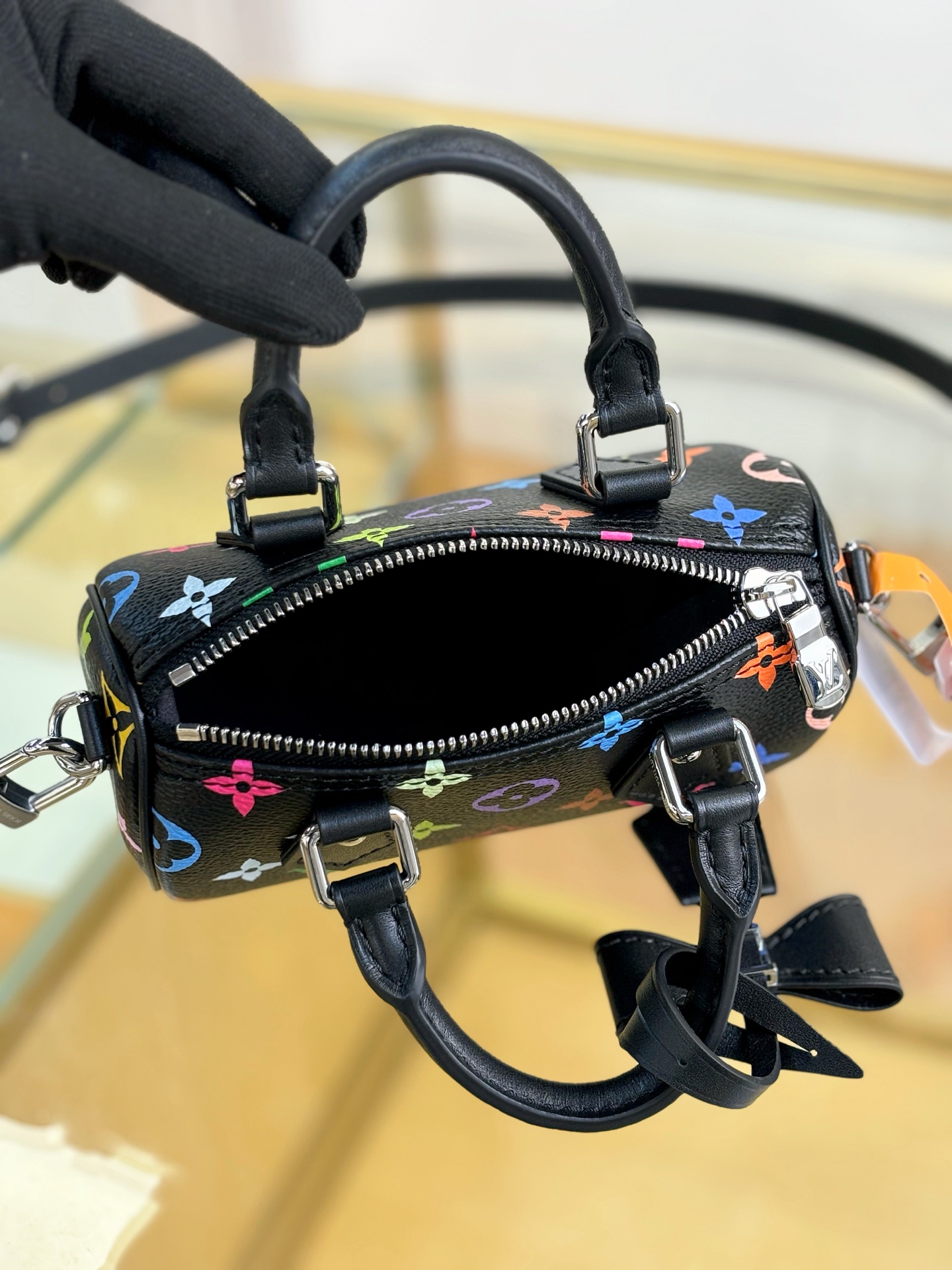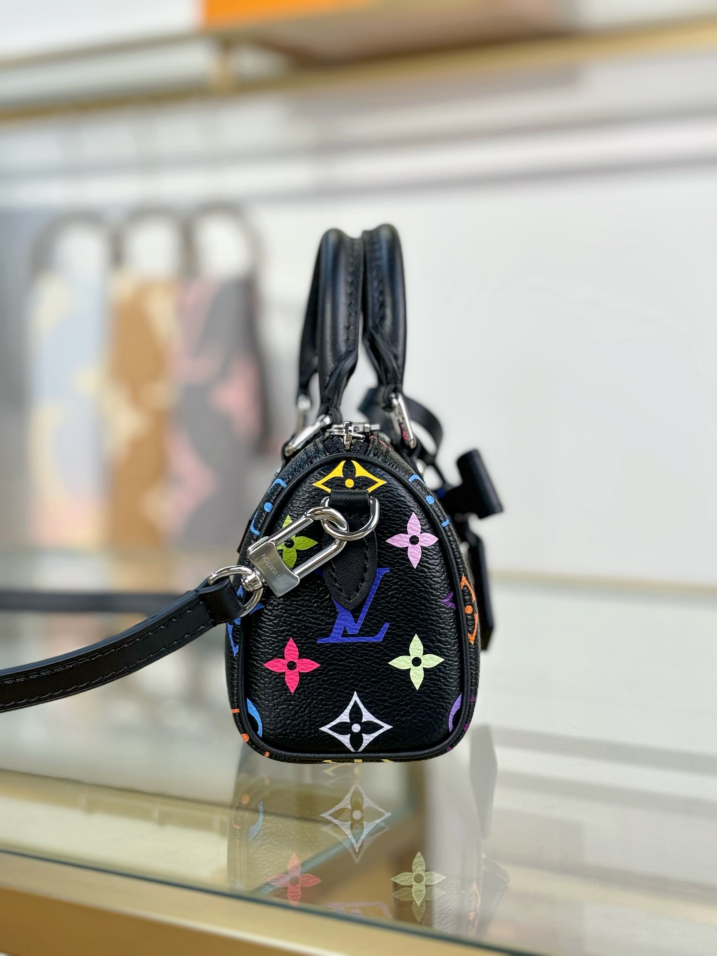 The scaled-down Nano Speedy makes a playful statement in Monogram coated canvas, which has been reworked in upbeat tones as part of the re-edition of the Louis Vuitton x Murakami collection. Natural cowhide leather trims add a timeless touch, as do two Toron top handles and a gleaming golden padlock in homage to the House’s travel heritage. Complete with a removable, adjustable strap and an exclusive LV x TM keybell.
