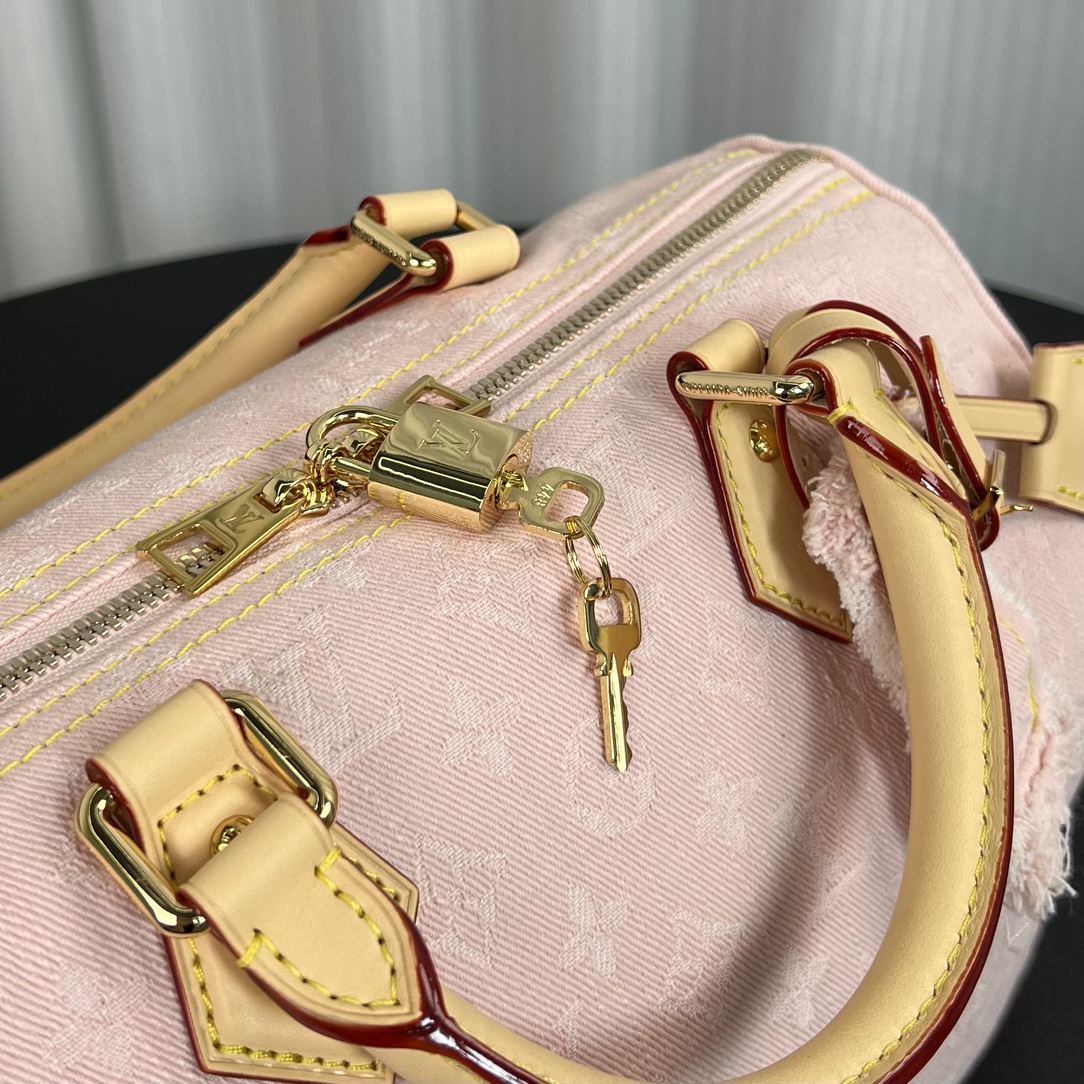 The Speedy Soft 30 is reimagined for the season with the return of the iconic 2005 Monogram Denim pattern. Crafted from organic cotton using a specialist LV bleaching technique, it is trimmed with leather and elevated with light gold-toned hardware. Signature details include a keybell and a removable name tag, both of which celebrate the House’s trunk-making heritage. Attach the toron handle for shoulder carry.