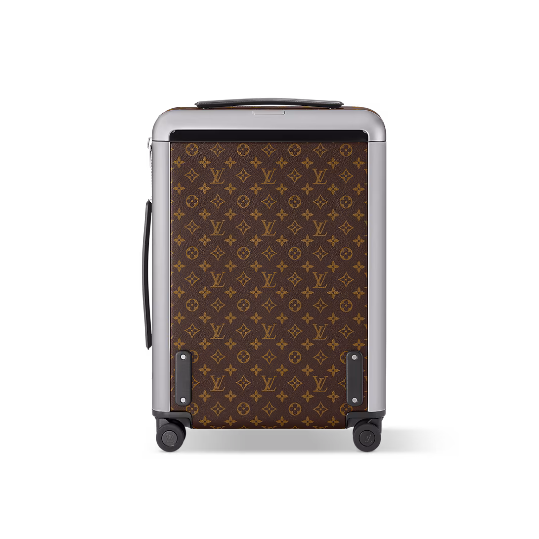 Inspired by the hazel-brown and black striped Macassar ebony wood, Nicolas Ghesquière has paired Monogram canvas with matte black leather and shiny aluminum hardware to create this Horizon 55 hard-sided bag for men. Small enough to use as carry-on luggage, this lightweight 4-wheeled bag boasts a surprisingly large interior thanks to its external handle frame.
