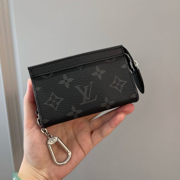 This key coin purse Voyage is made of Monogram Eclipse canvas trimmed with cowhide and has a zipper design. In addition to keys, it can also carry change, folded banknotes and business cards. The key holder can be hung on the D-ring found in most Louis Vuitton handbags.
