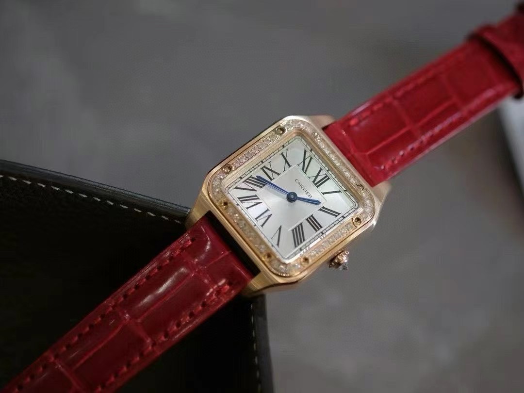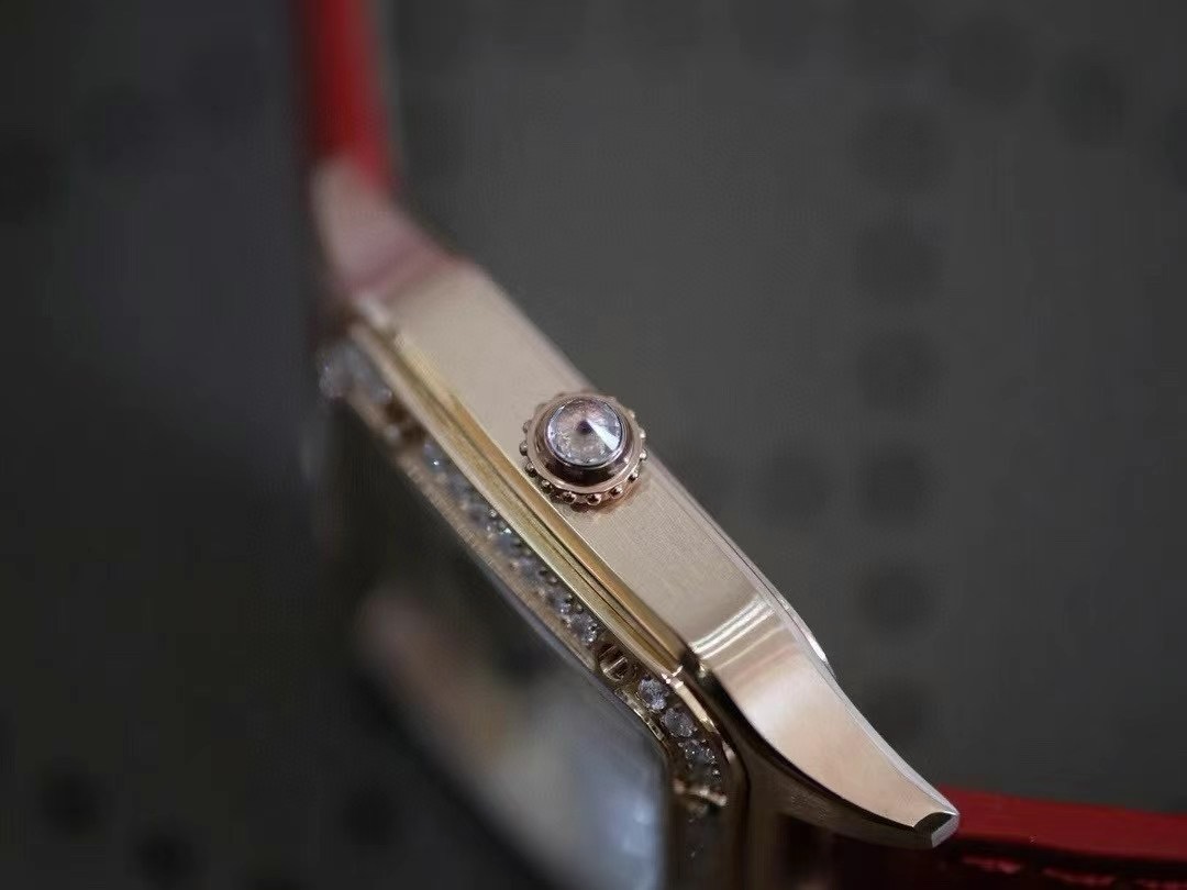 Shiny burgundy alligator-skin strap, rose gold 750/1000 ardillon buckle. Case dimensions: 38 mm x 27.5 mm, thickness: 7.3 mm.