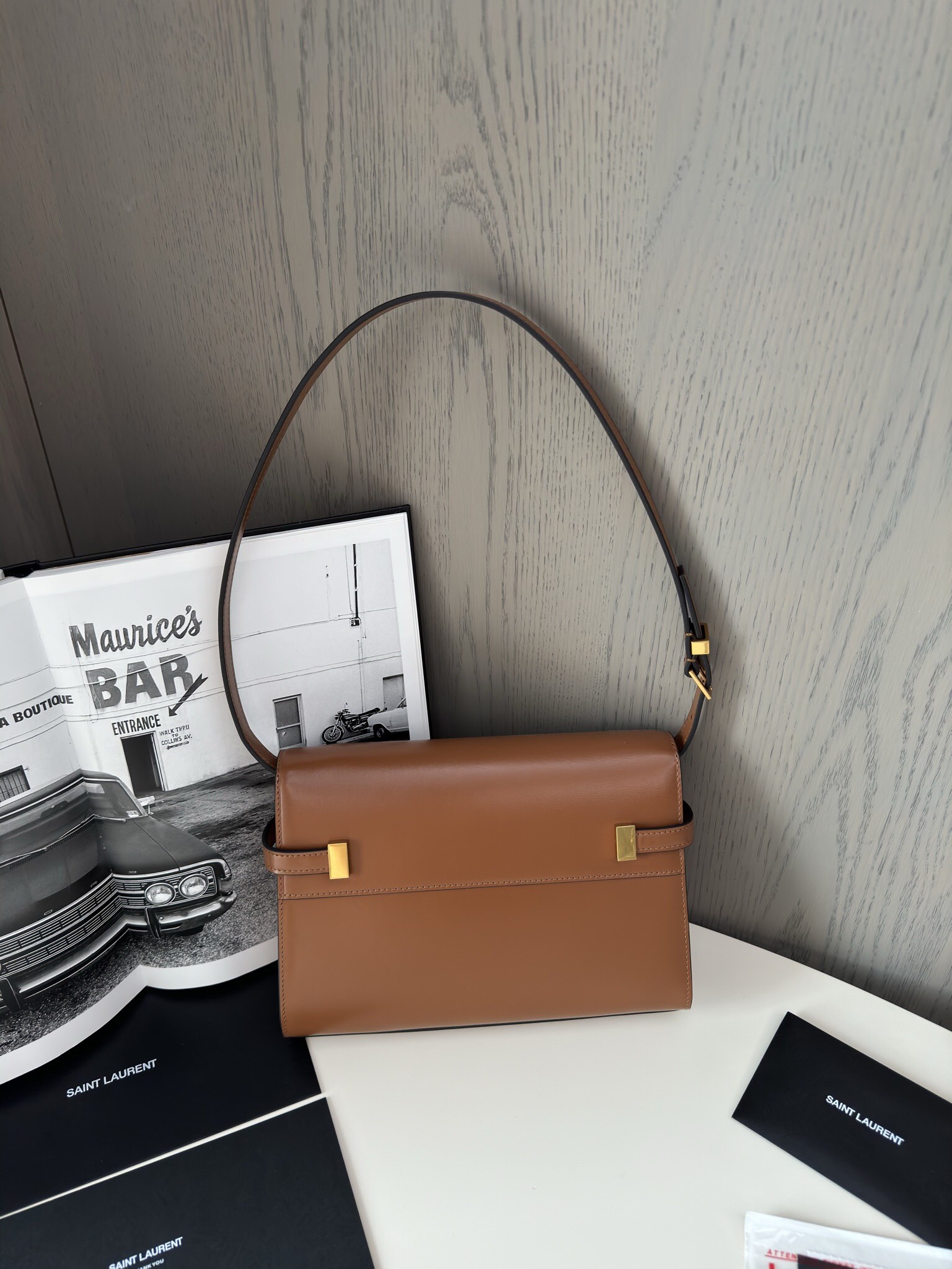 Brown ‘Manhattan Small’ shoulder bag from Saint Laurent. Crafted from smooth calf leather, this design features a decorative logo-engraved snap closure, detachable and adjustable strap, gold-tone metal hardware and one internal compartment with one slip pocket.