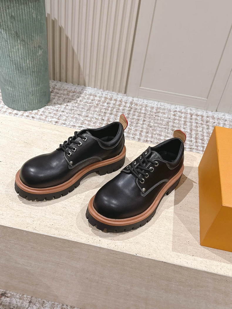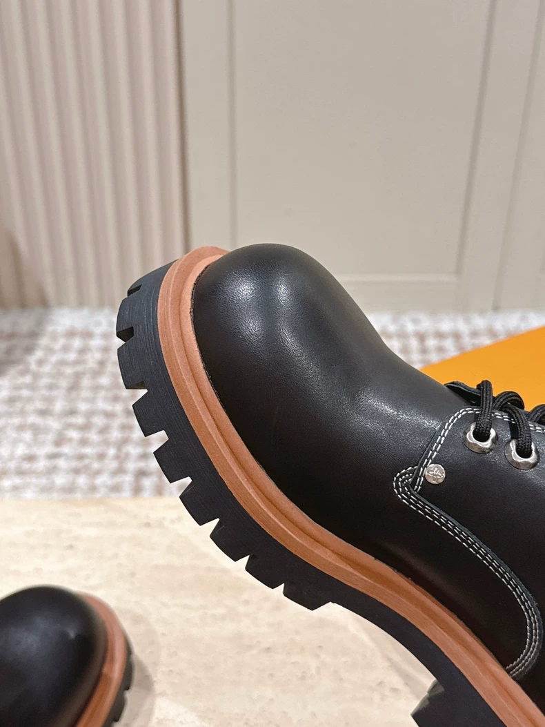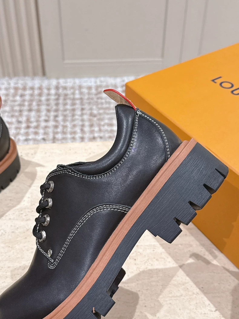 The LV Remix derby takes its design inspiration from classic hiking boots, which it transforms into a stylish, on-trend look. The upper in smooth calf leather is complemented by rich detailing, including a back tab and key bell inspired by Louis Vuitton leather goods. This model is finished with a robust yet lightweight rubber outsole.
