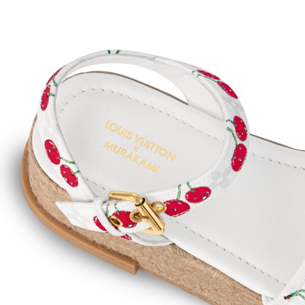 The Maya platform sandal is refreshed with spirited, summery codes from the re-edition of the coveted Louis Vuitton x Takashi Murakami collection. The straps catch the eye in Monogram coated canvas in a subtle shade layered with colorful cherry motifs in the Japanese artist’s signature kawaii style. A golden buckle adds a chic metallic accent, while the chunky platform is finished in braided rope for a breezy espadrille-inspired finish.