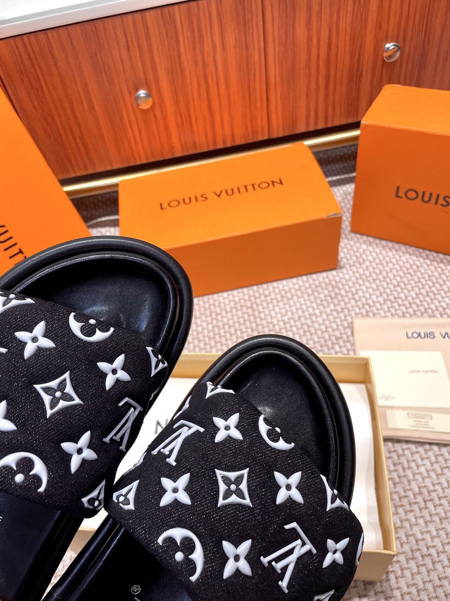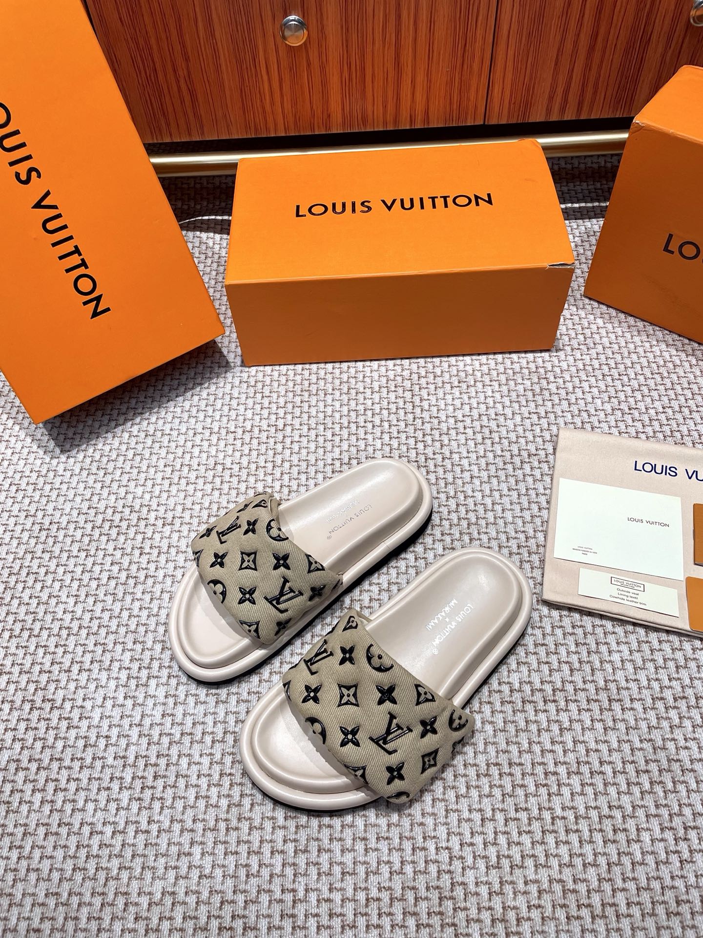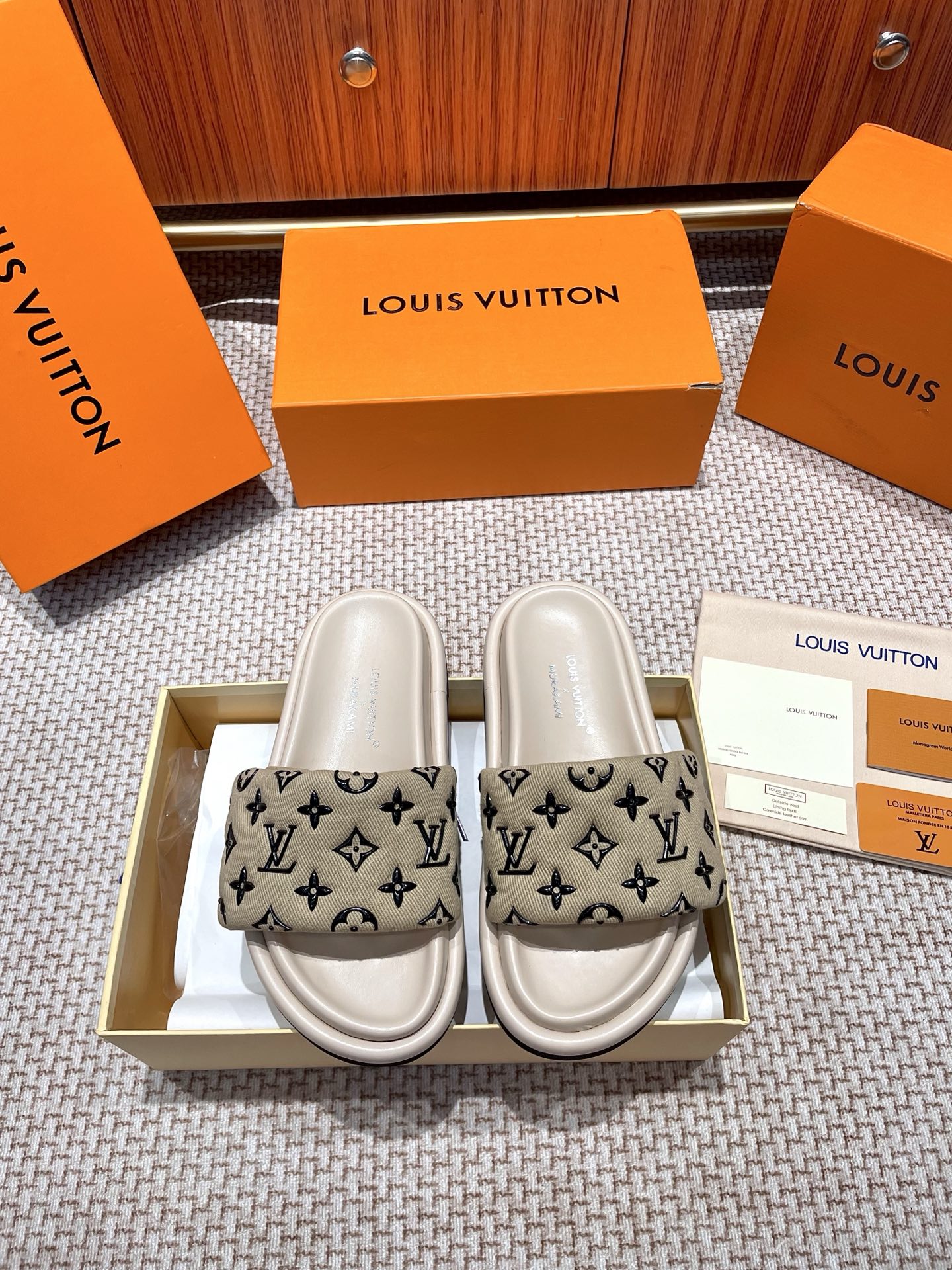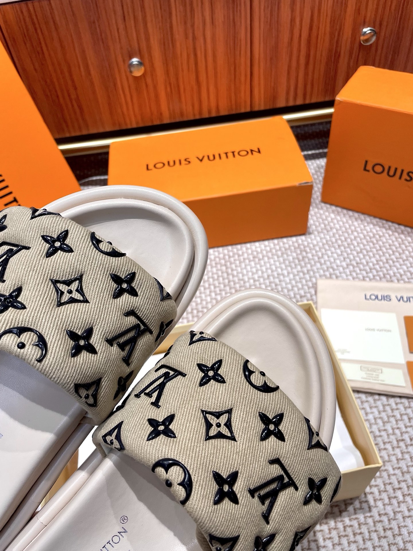 The ultimate summer luxury! These LV slides feature an embossed Monogram pattern recreated with high-frequency technology on a custom high-tech fabric. The plush, padded upper includes adjustable Velcro straps for a perfect fit, while the soft lambskin lining and original molded rubber foam outsole ensure all-day comfort and style.