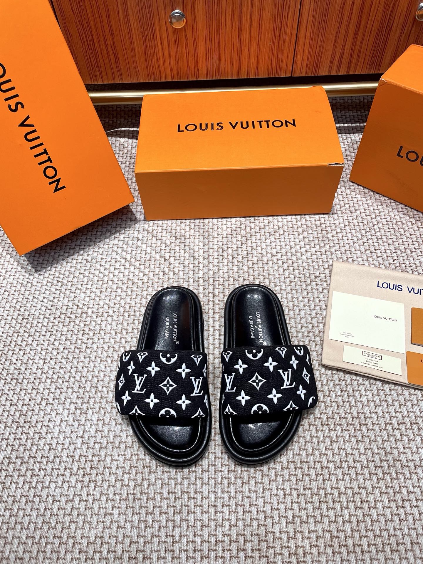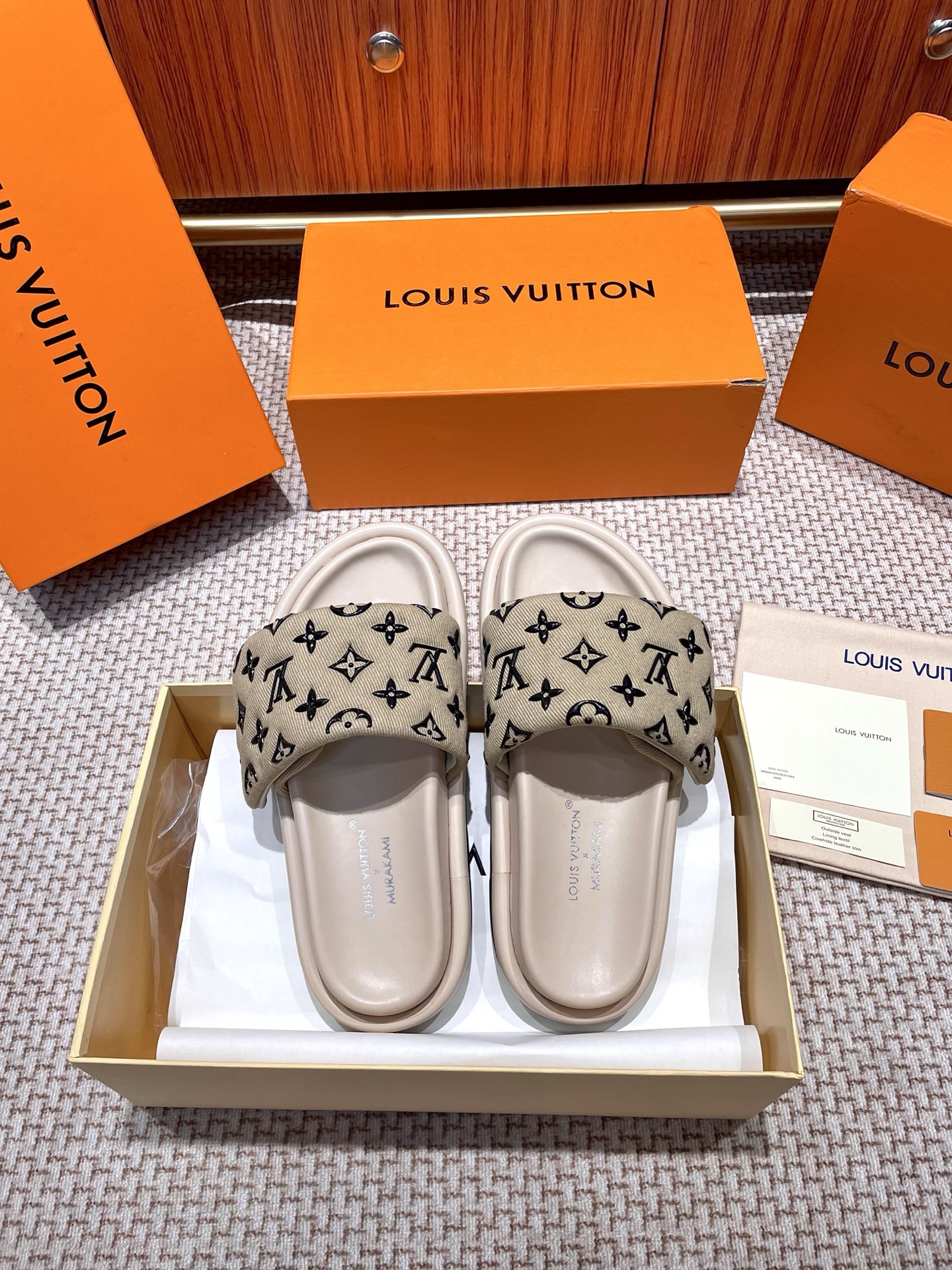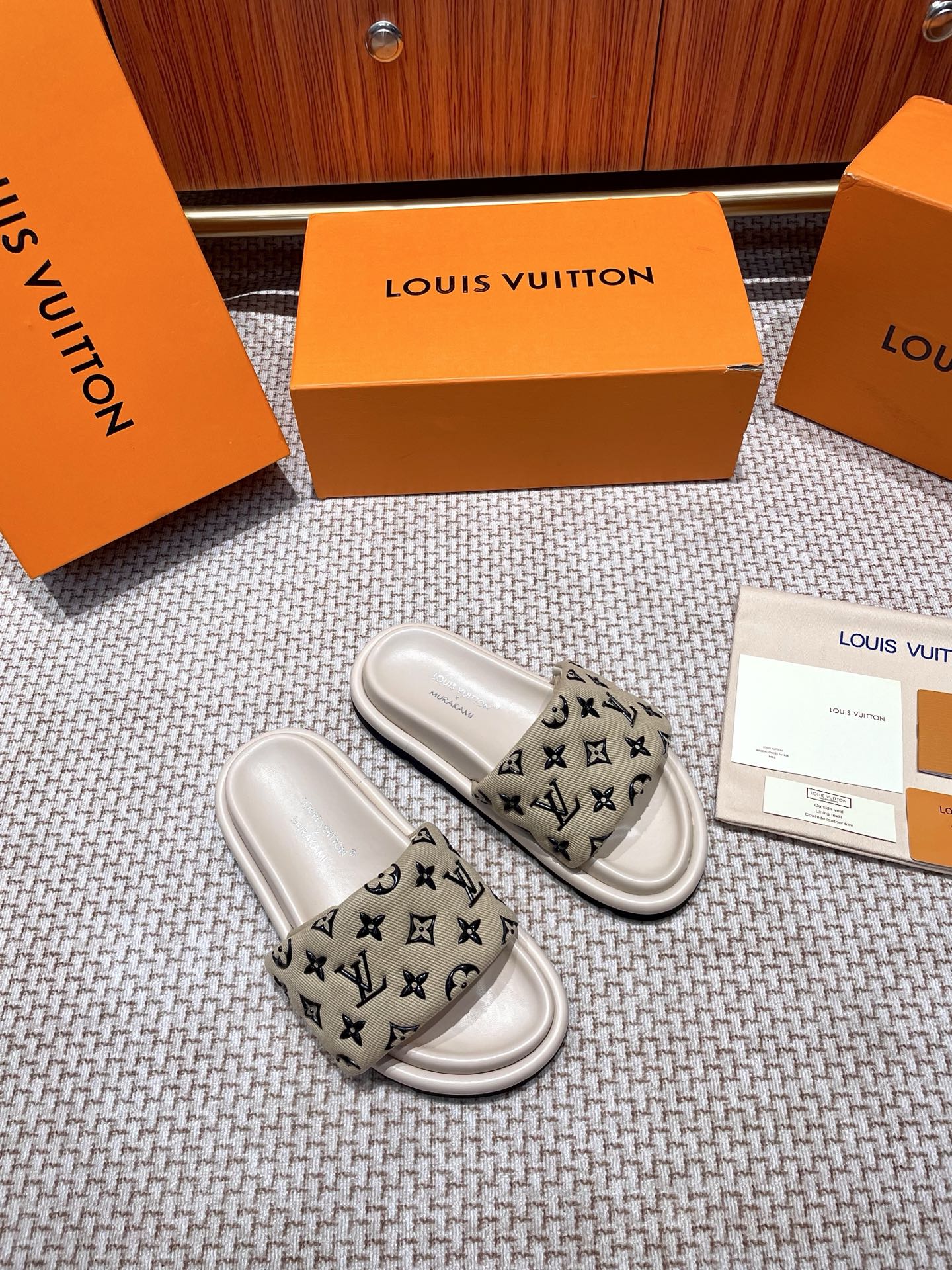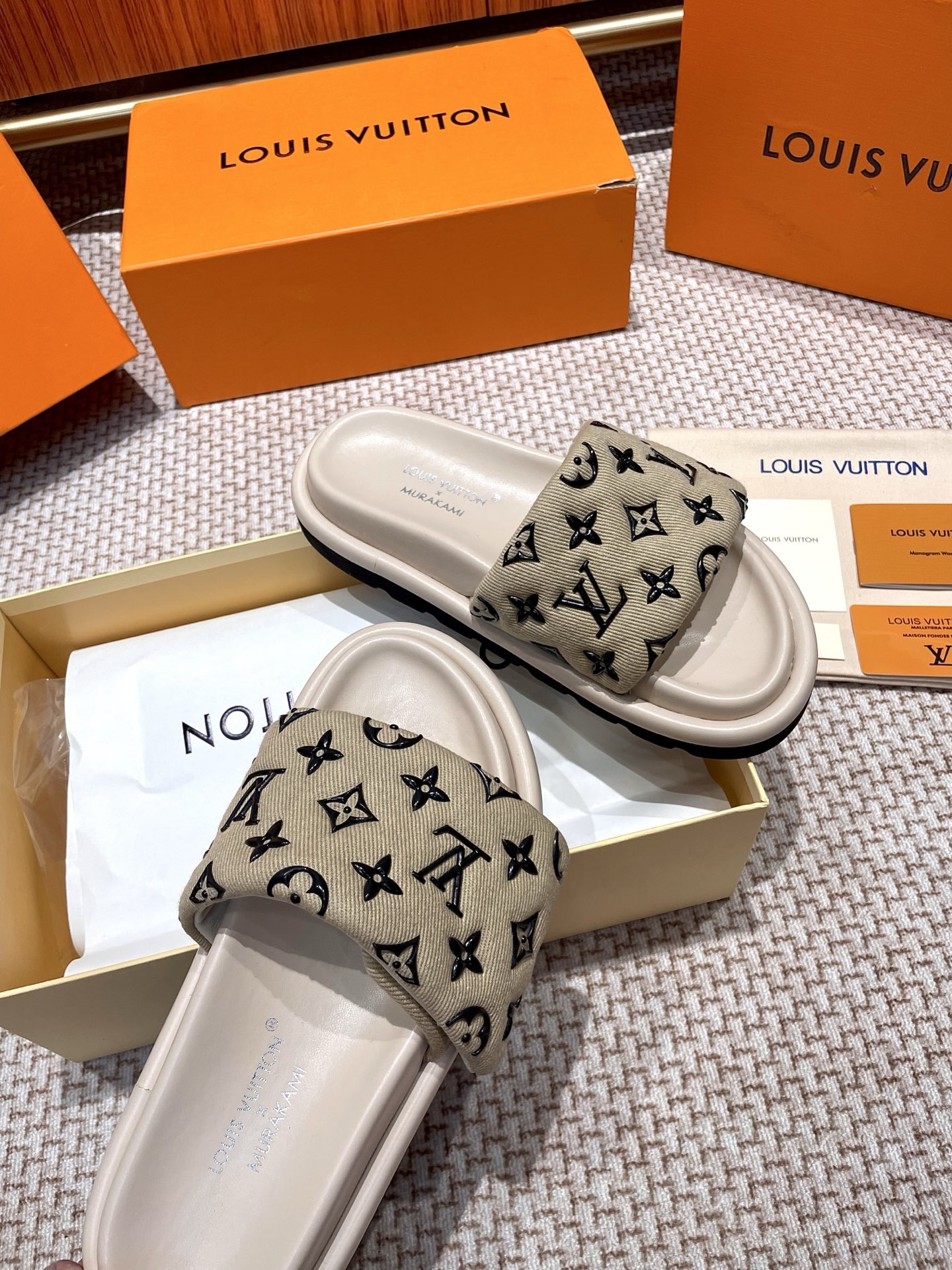 The ultimate summer luxury! These LV slides feature an embossed Monogram pattern recreated with high-frequency technology on a custom high-tech fabric. The plush, padded upper includes adjustable Velcro straps for a perfect fit, while the soft lambskin lining and original molded rubber foam outsole ensure all-day comfort and style.