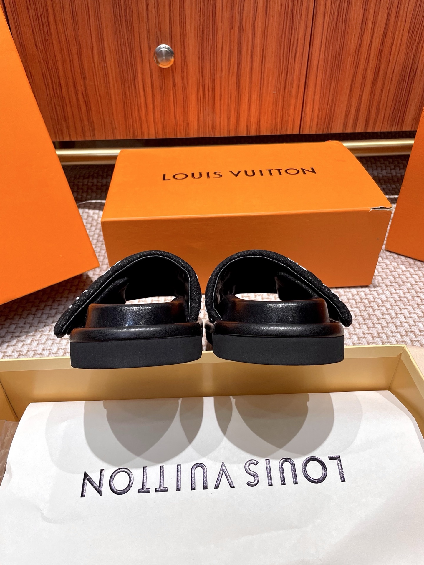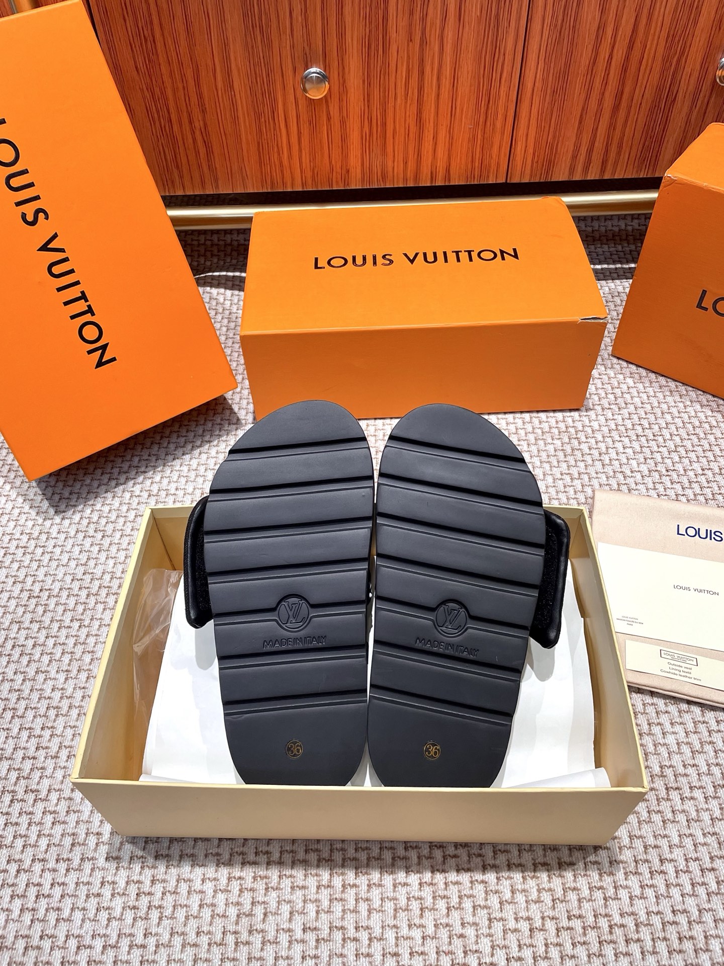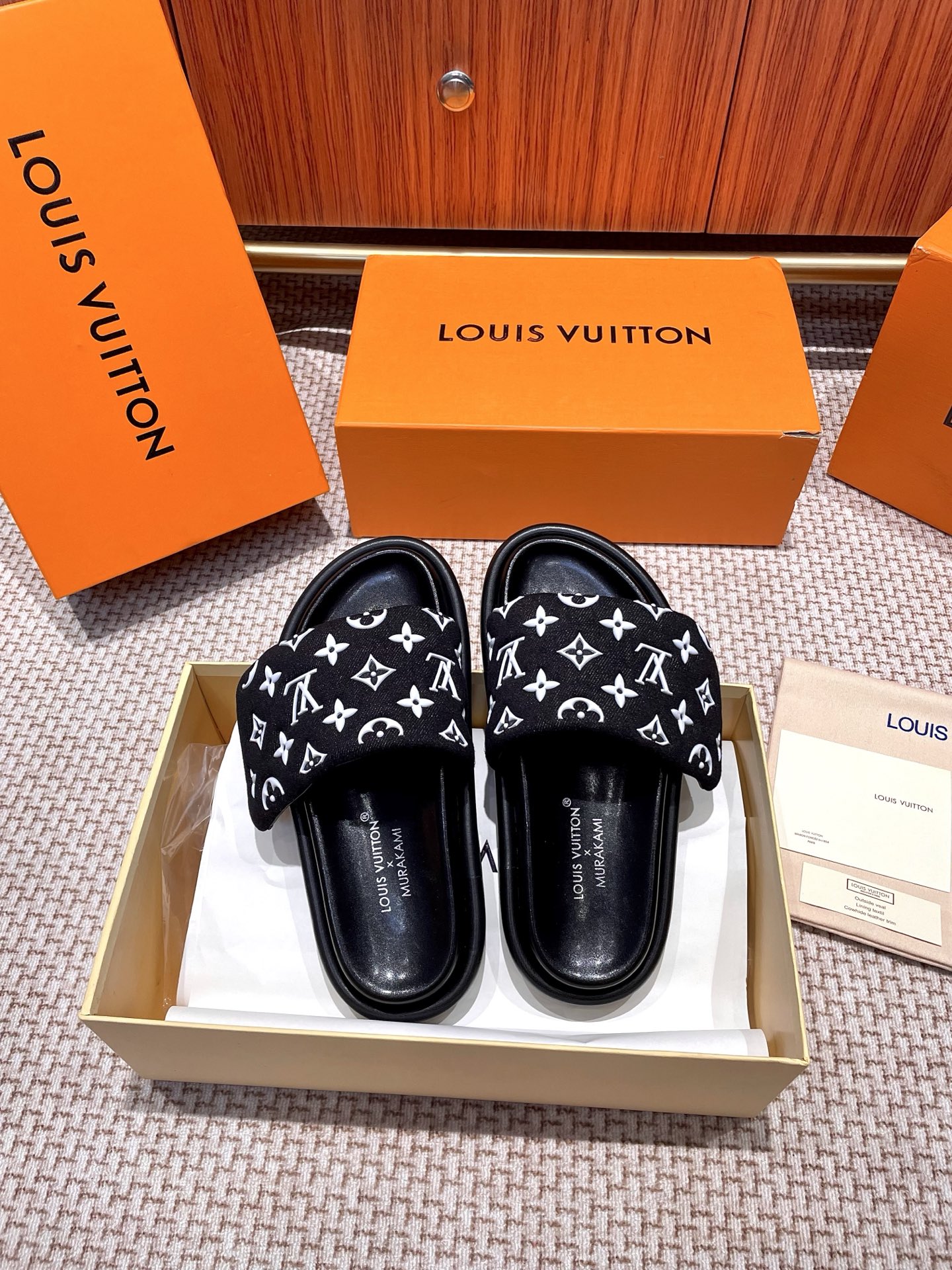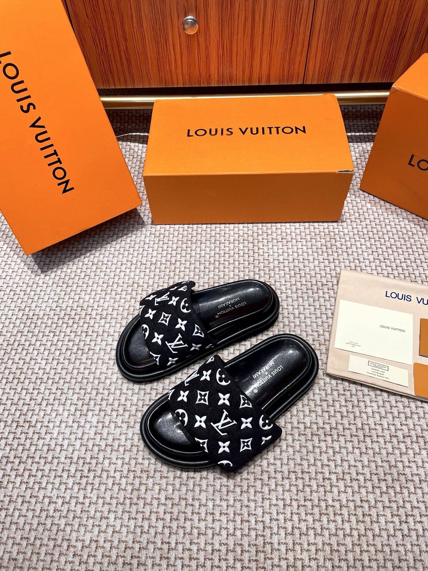 The ultimate summer luxury! These LV slides feature an embossed Monogram pattern recreated with high-frequency technology on a custom high-tech fabric. The plush, padded upper includes adjustable Velcro straps for a perfect fit, while the soft lambskin lining and original molded rubber foam outsole ensure all-day comfort and style.